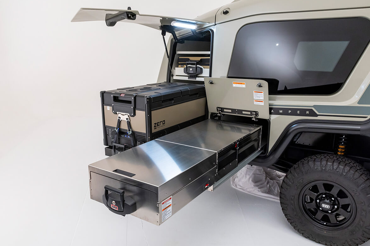 Go fully off-grid with the built-in 120W solar panel and 100Ah lithium battery, or expand your system for even longer runs. The rear hatch drops down to form an outdoor deck or dining area, giving you that open-air vibe without the bugs.