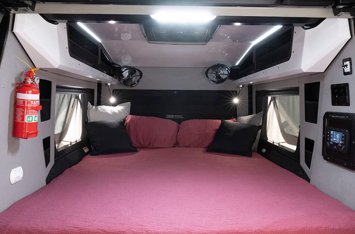 Inside, you’ll find a full queen-size bed, thick foam mattress, and clever storage that makes every inch count. The side slide-out kitchen houses a three-burner cooktop, sink, and dual-zone 96L fridge/freezer — everything you need to feed the crew miles from civilization.