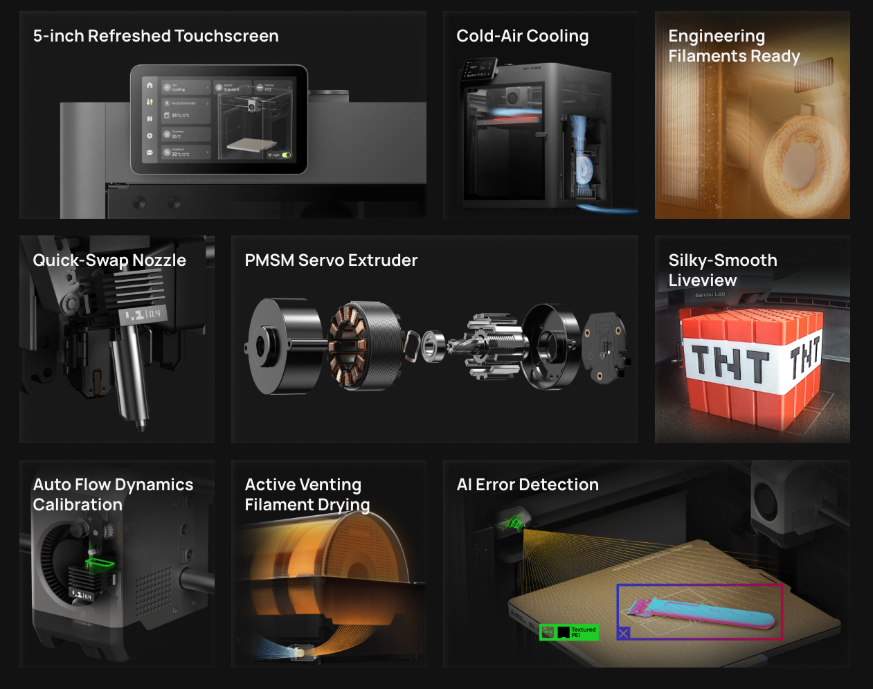With a 256×256×256 mm build volume, better airflow management, quick-swap hotend access, and automatic calibration, you can tackle everything from functional prototypes to clean-finished miniatures. It’s built for versatility: PLA, PETG, ABS, PC, nylon, carbon fiber blends, and more.
