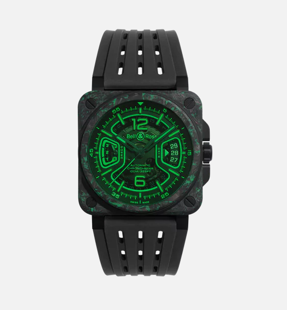 The BR-X3 Night Vision builds on Bell & Ross’ iconic square-case silhouette — a design rooted in cockpit instruments and military precision.