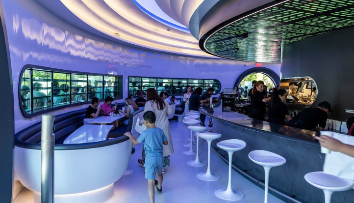 The design pays tribute to mid-20th-century American diner culture — think neon lighting, stainless steel, retro booths — but layered with futuristic touches: metallic finishes, “Cybertruck-style” packaging, robots handing out popcorn on the rooftop, and in-car ordering via the vehicle’s touchscreen if you own one.