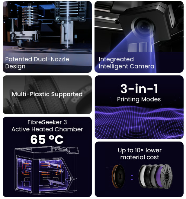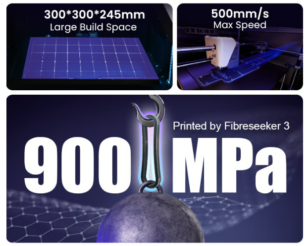 The FibreSeeker 3 delivers consumer-grade engineering performance because it operates quickly and has a strong design structure. The FibreSeeker 3 represents the world's first affordable desktop 3D printer which enables users to print with continuous carbon fiber materials.