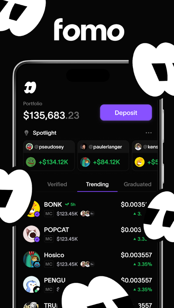 FOMO is a new kind of crypto app — part trading platform, part social network, and part trend radar. The idea is simple: instead of trading alone in the dark, you can see what other traders are doing in real time.
