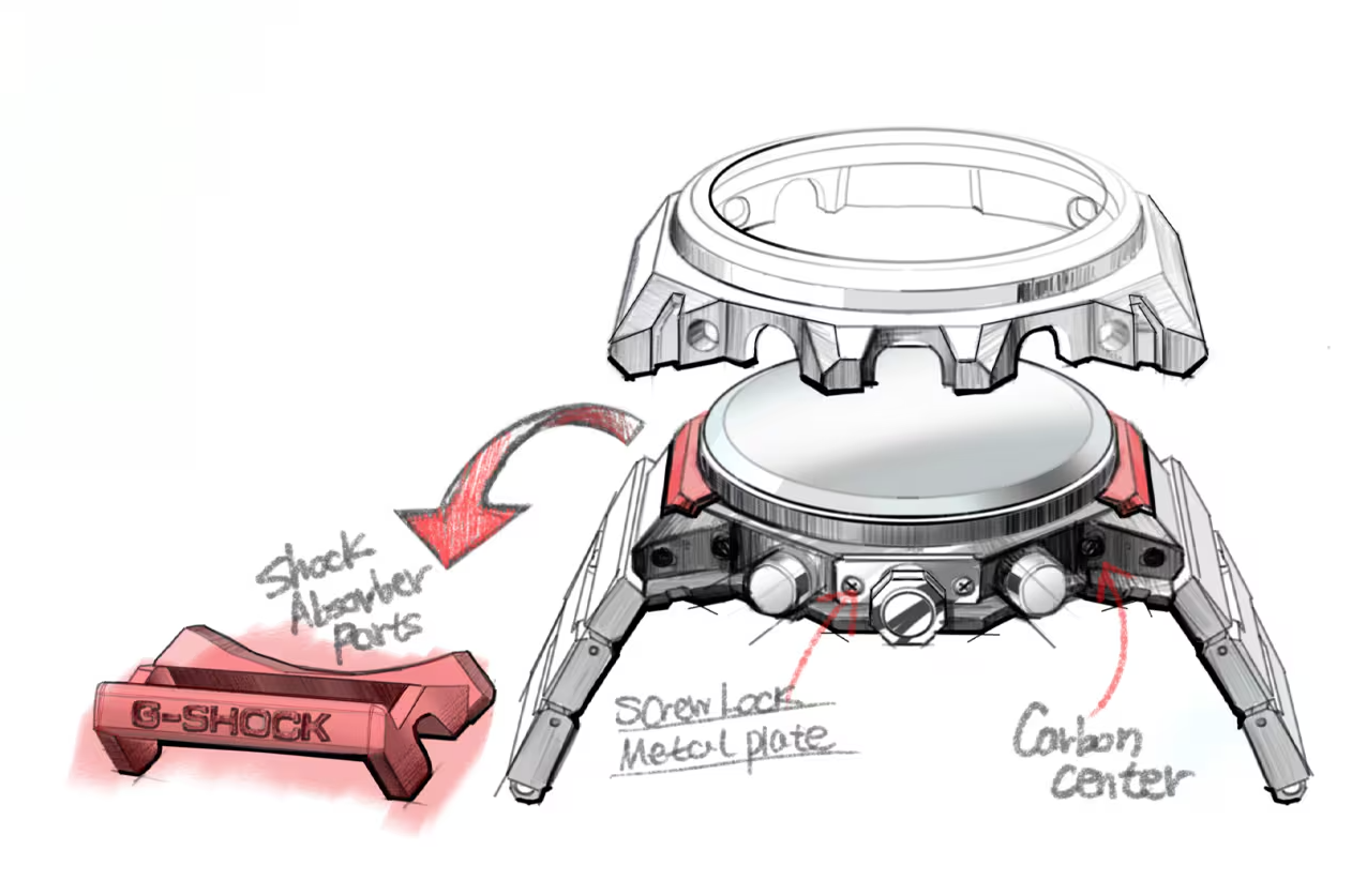 Under that brushed stainless-steel armor lies a carbon-reinforced resin core, keeping it light but nearly indestructible. Urethane shock buffers at the bracelet connection points absorb stress from impact — a subtle but brilliant detail that ensures long-term durability.