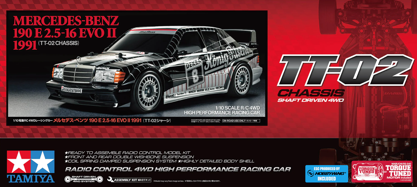 Tamiya’s done it again — bringing back one of the most iconic DTM racers of all time, now in a perfectly detailed R/C replica that’s as fun to drive as it is to display. The new Mercedes-Benz 190 E 2.5-16V EVO II (1991) lands on Tamiya’s proven TT-02 4WD chassis, making it the perfect mix of old-school motorsport style and modern R/C performance.