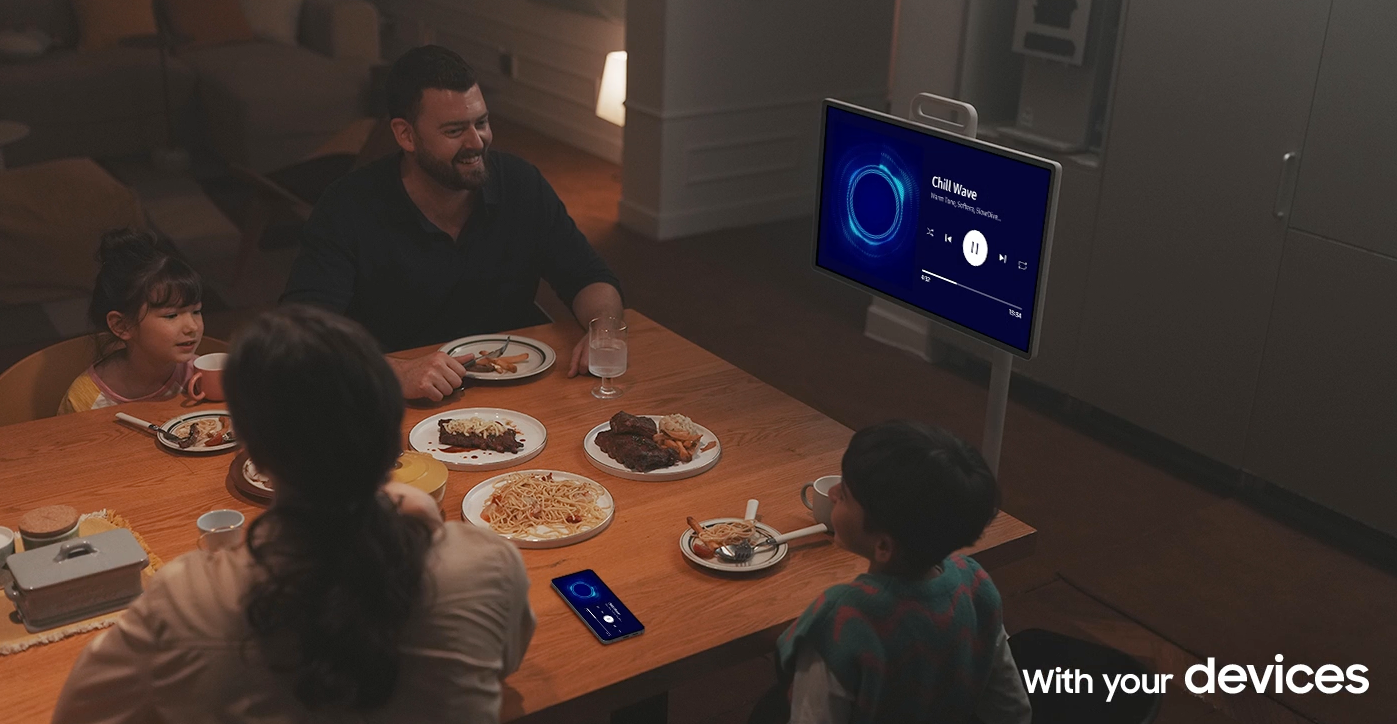The device serves as a single solution which replaces the need for multiple TVs and pop-up monitors and kitchen displays and bedroom screens and workstations.